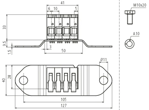 | Max. short-circuit current (AC 50 Hz / DC / 5 s) St/tZn Ø10 mm | 1000 A / T4 |