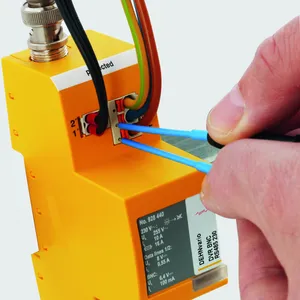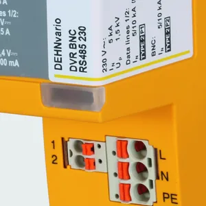 Compact 3-in-1 surge arrester for protecting analogue camera systems. Protection of the video signal (BNC connection), a data signal (RS485) and a voltage supply (230 V a.c.). Direct plug-in technology allows fast conductor connection without tools. Easy replacement of the arrester is ensured by the integrated terminal units which can be released and then removed from the enclosure. Integrated overload indication (230 V).