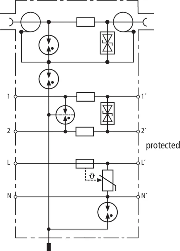 Compact combined arrester for protecting electroacoustic systems (e.g. voice alarm systems, loudspeaker systems). Protection of one galvanically isolated pair; direct or indirect shield earthing. Direct plug-in technology allows fast conductor connection without tools. Easy replacement of the arrester is ensured by the integrated terminal units which can be released and then removed from the enclosure. Integrated remote signalling contact (break contact).