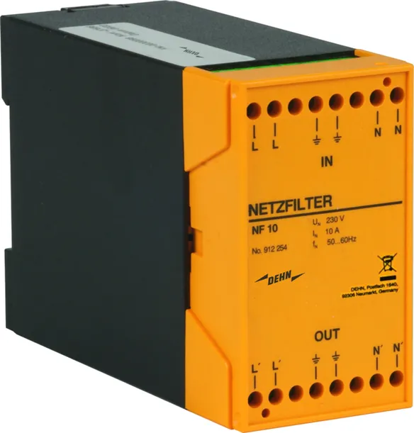 Netzfilter NF 10 Netzfilter zum Schutz von empfindlichen Endverbrauchern der Automatisierungstechnik vor hochfrequenten Störspannungen Nennspannung: 230 V/50 Hz Nennstrom: 10 A Dämpfung (1 MHz): sym. > 64 dB asym. > 69 dB Vorsicherung: 10 A gL/gG Abmessungen: 110 x 45 x 75 mm Montage auf Hutprofilschiene 35 mm nach EN 50022