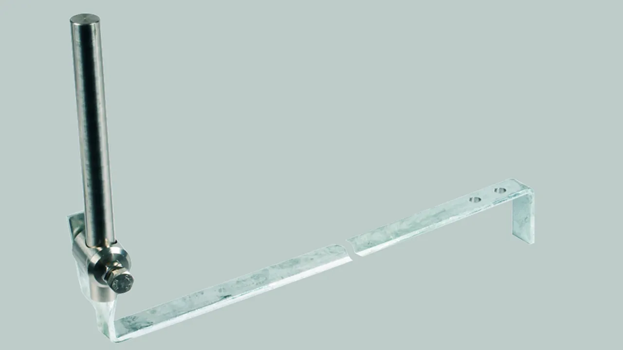 Als Fußpunkt zum Befestigen von Fangstangen auf Steildächern, mit Verdrehschutz (Zahnscheibe) und Kontermutter, inkl. Befestigungsbohrungen zum Verschrauben der Strebe mit der Dachlattung.