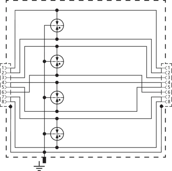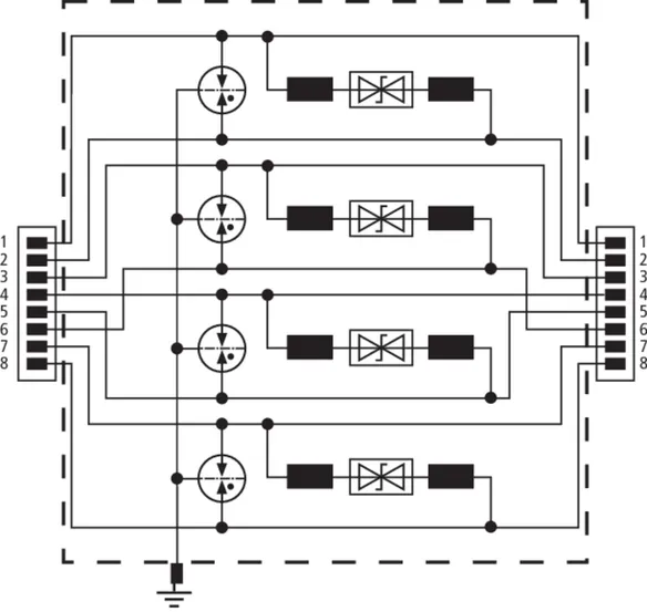 Universal, space-saving combined arrester of 19 mm in width and RJ45 connection system with status indication for simple maintenance. Protection of applications in structured cabling according to class EA to 500 MHz; e.g. industrial Ethernet, data distributors, digital camera systems, Power over Ethernet (IEEE 802.3 compliant to 4PPoE) and Ethernet-based interfaces in general. Protection of all pairs through powerful gas discharge tubes and protective diodes between signal cores and pairs. Fully shielded adapter design with RJ45 sockets for DIN rail mounting. With additional screw connection on the enclosure for an optional earth connection.