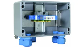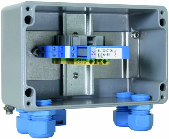 Prewired BXT ML4 BD EX 24 and BXT BAS EX surge arrester unit completely mounted in a junction box for intrinsically safe measuring circuits, meets FISCO requirements.