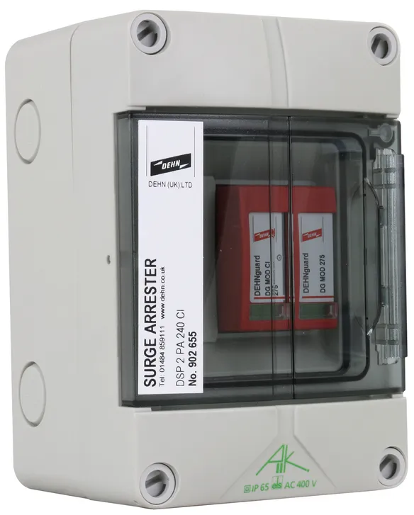 Mains connection box kit for the single-phase 240 V TN system consisting of IP 65 enclosure equipped with DEHNguard modular CI surge arrester (Part No. 952 173) or as version ... PA ... equipped with surge arrester (Part No. 952 178) with integrated remote signalling contact for monitoring device