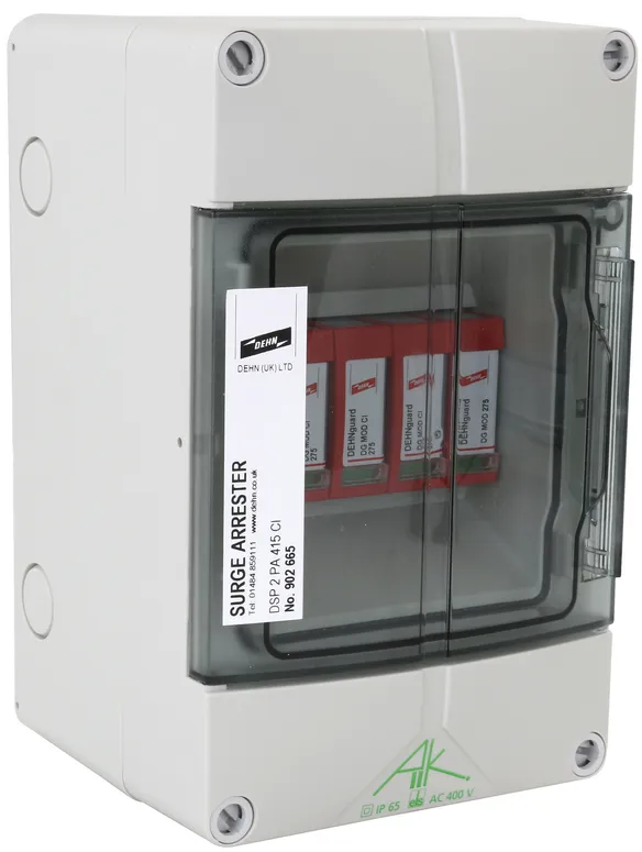 Mains connection box kit for the three-phase 240/415 V TN(C)-S system consisting of IP 65 enclosure equipped with DEHNguard modular CI surge arrester (Part No. 952 401) or as version ... PA ... equipped with surge arrester (Part No. 952 406) with integrated remote signalling contact for monitoring device