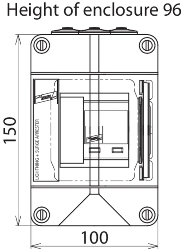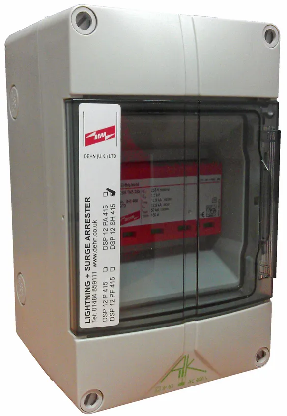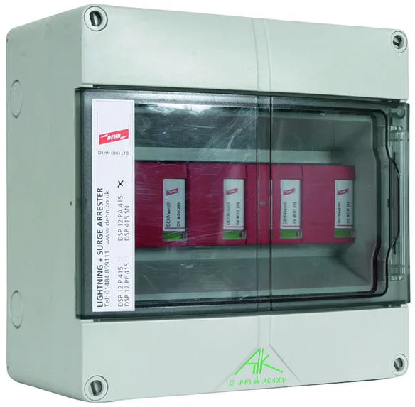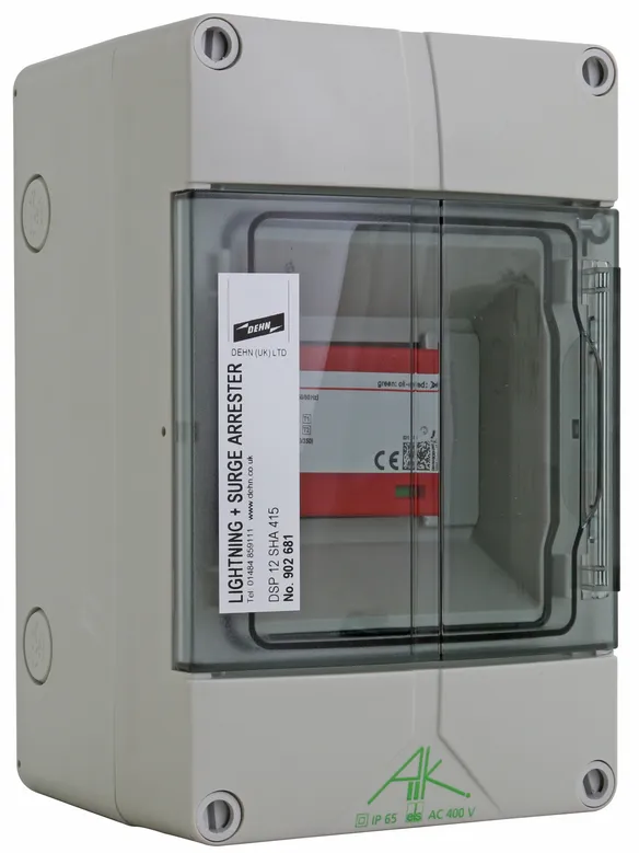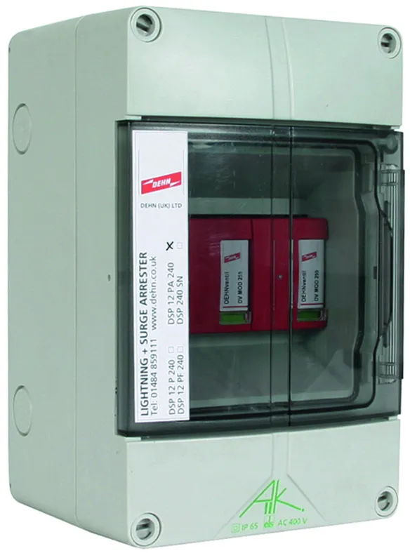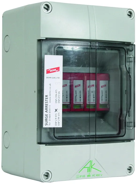 Mains connection box kit for the three-phase 240/415 V TNS system consisting of IP 65 enclosure equipped with combined lightning current and surge arrester DEHNvenCI (Part No. 961 200) or as version ... PA ... equipped with combined lightning current and surge arrester (Part No. 961 205) with integrated remote signalling contact for monitoring device