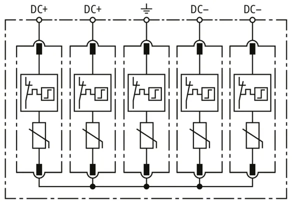 | Nominal discharge current (8/20 µs) [(DC+/DC-) --> PE] (In ) | 20 kA |