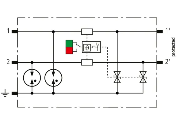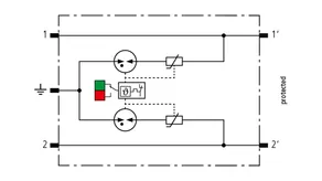 Space-saving, modular lightning current arrester with a width of 6 mm and push-in connection technology with status indication for protecting two single lines for lightning equipotential bonding as well as indirect earthing of shielded cables. With signal disconnection for maintenance purposes.