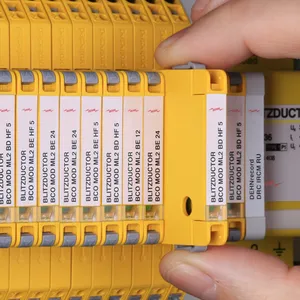 Combined arrester protection module with a width of 6 mm for BLITZDUCTORconnect with status indication for protecting one pair in 24 V DC systems. Also suitable for use with an earthed negative pole. Integrated PTC resistors allow for secure resetting of the arrester after interference in the system circuit with short-circuit currents of up to 40 A.