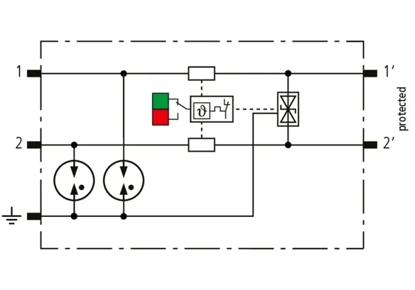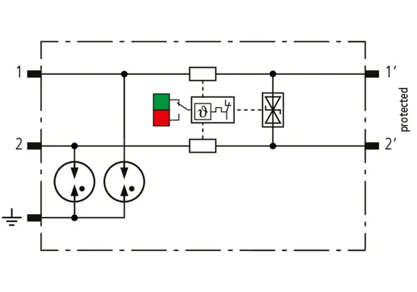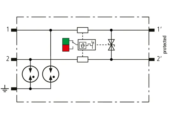 Space-saving, modular lightning current arrester with a width of 6 mm and push-in connection technology with status indication for protecting two single lines for lightning equipotential bonding as well as indirect earthing of shielded cables. With signal disconnection for maintenance purposes.
