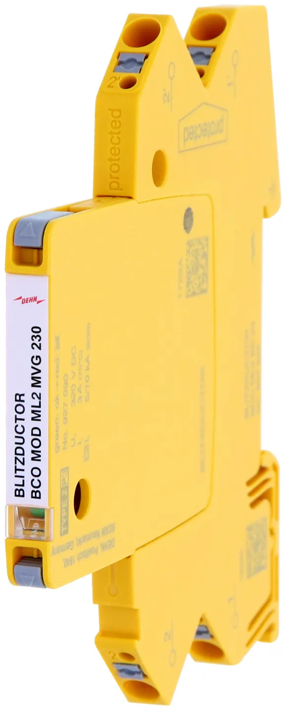 Surge arrester protection module with a width of 6 mm for BLITZDUCTORconnect with status indication for protecting 2 lines of stranded unearthed signal interfaces with a nominal voltage of 230 V.