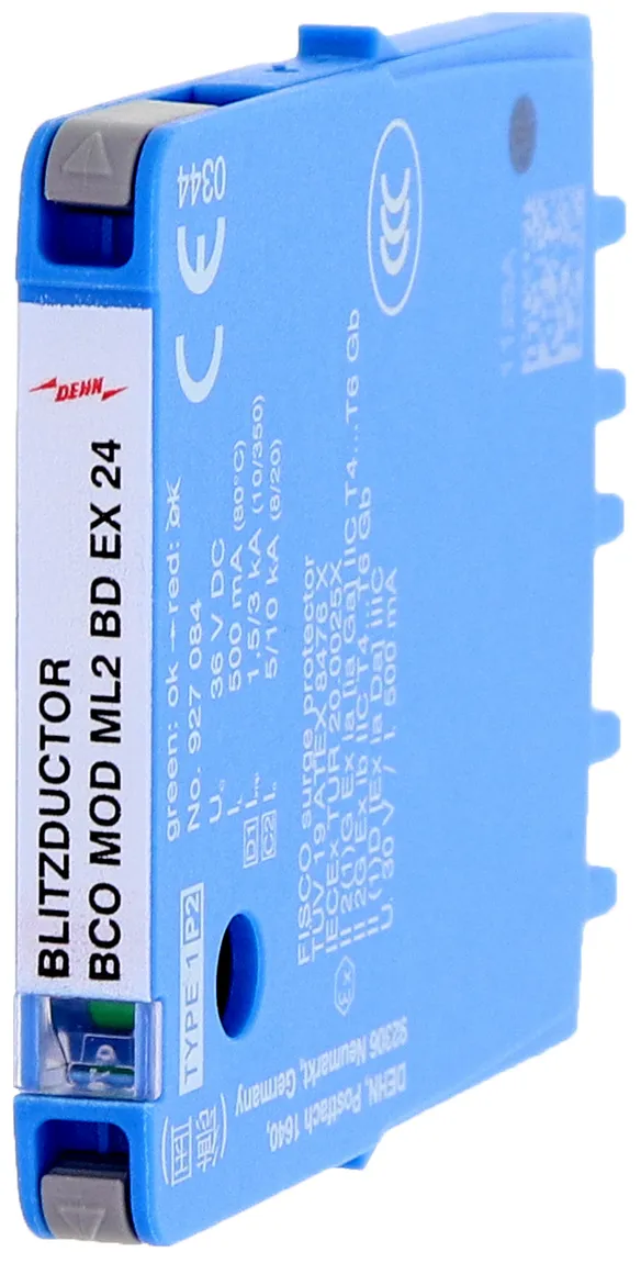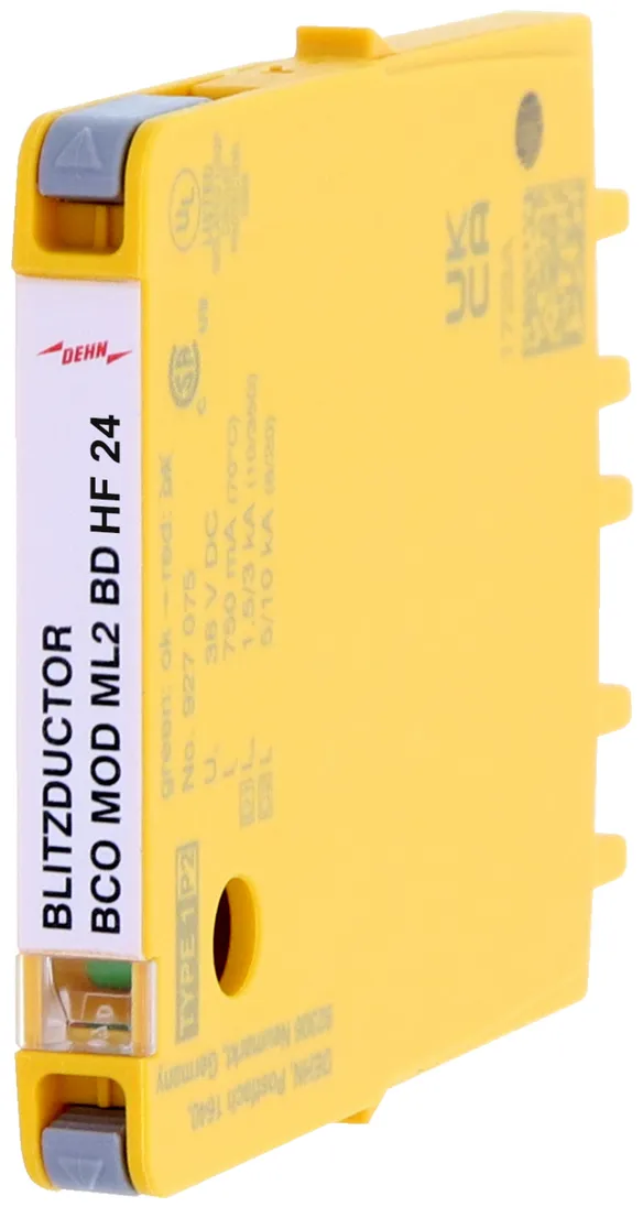Combined arrester protection module with a width of 6 mm for BLITZDUCTORconnect with status indication for protecting one pair in 24 V DC systems. Also suitable for use with an earthed negative pole. Integrated PTC resistors allow for secure resetting of the arrester after interference in the system circuit with short-circuit currents of up to 40 A.