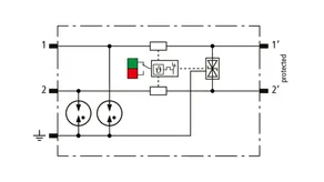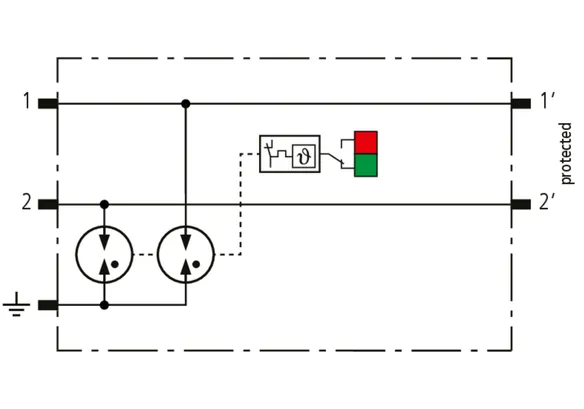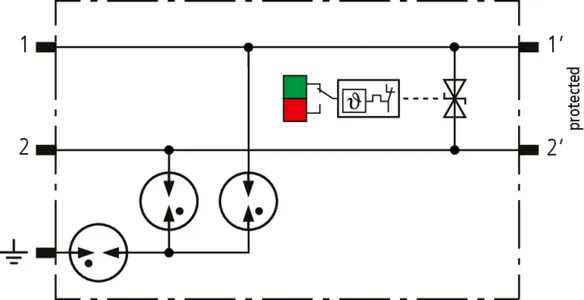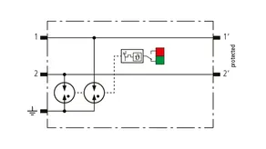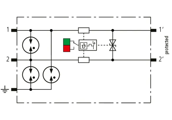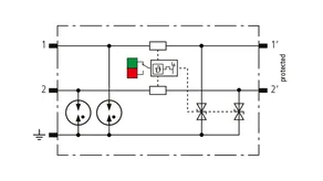 Space-saving, modular lightning current arrester with a width of 6 mm and push-in connection technology with status indication for protecting two single lines for lightning equipotential bonding as well as indirect earthing of shielded cables. With signal disconnection for maintenance purposes.