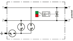 Space-saving, modular surge arrester with a width of 6 mm and push-in connection technology with status indication for protecting 2 lines of stranded unearthed signal interfaces with a nominal voltage of 230 V. With signal disconnection for maintenance purposes.