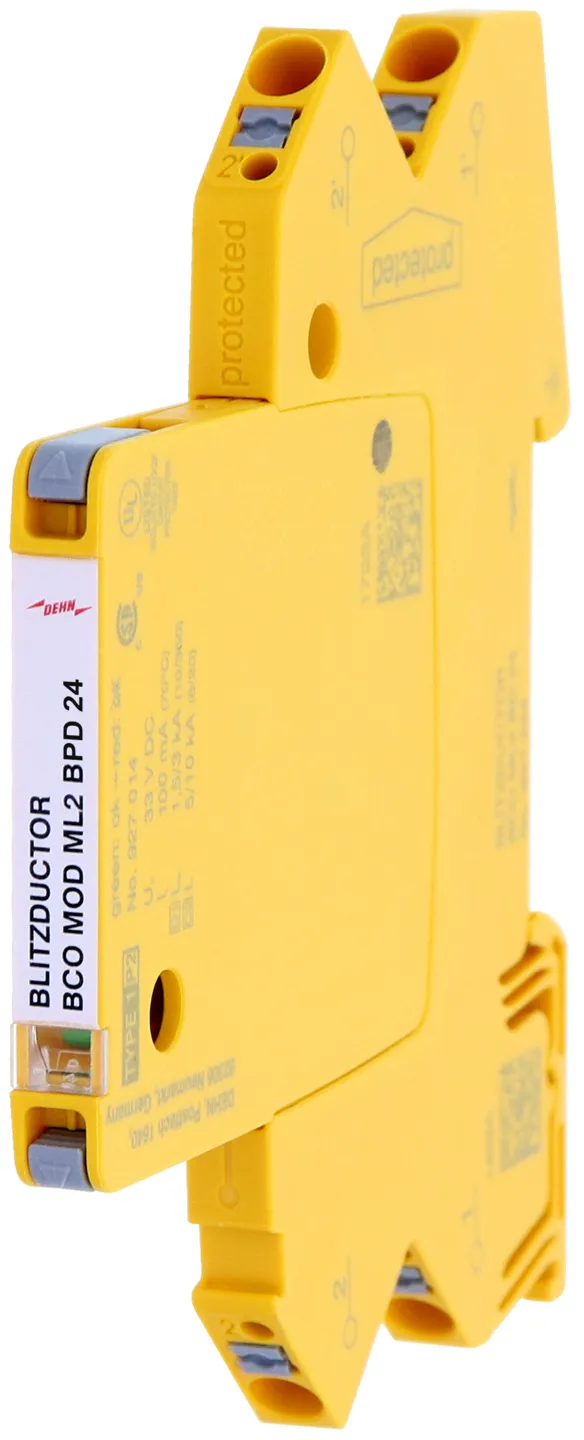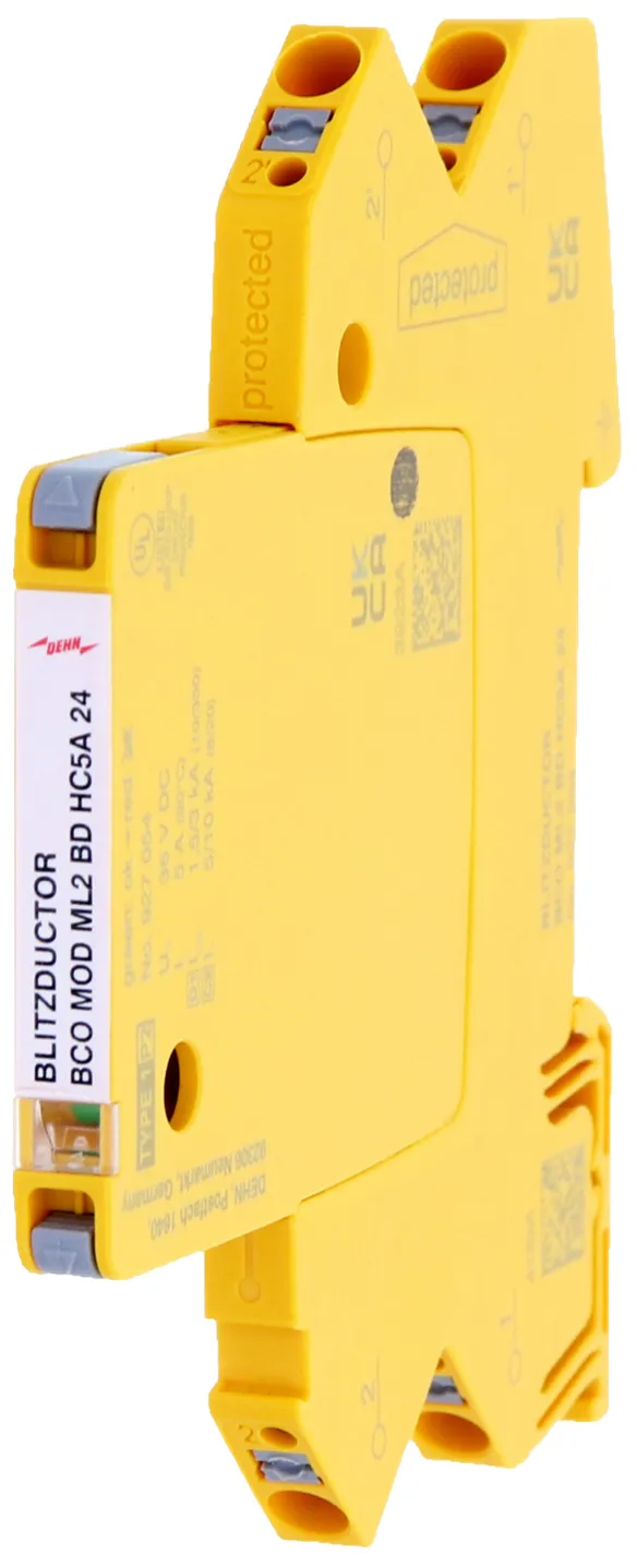 Combined arrester protection module with a width of 6 mm for BLITZDUCTORconnect with status indication for protecting one pair in 24 V DC systems. Also suitable for use with an earthed negative pole. Integrated PTC resistors allow for secure resetting of the arrester after interference in the system circuit with short-circuit currents of up to 40 A.
