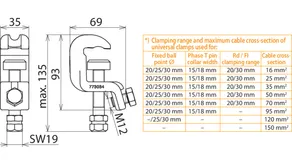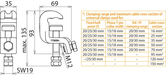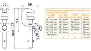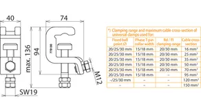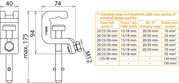 *) See table for „Clamping range and maximum cable cross-section of universal clamps used for"