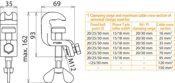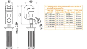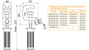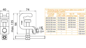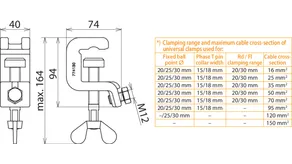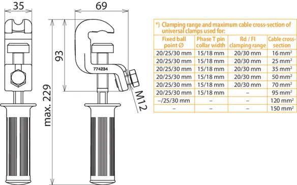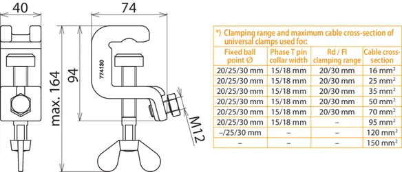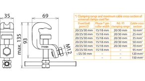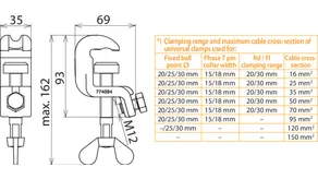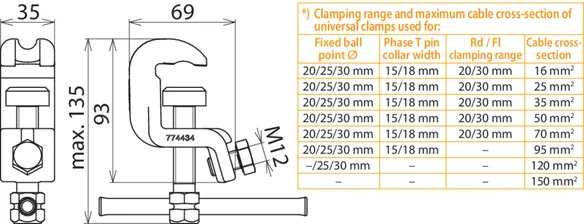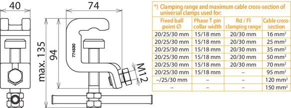 *) See table for „Clamping range and maximum cable cross-section of universal clamps used for“