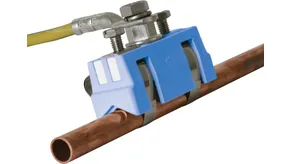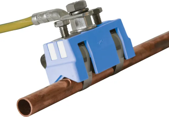 Up until now, connections for the equipotential bonding and the lightning equipotential bonding in hazardous areas have often been welded or made with threaded bushings. The use of clamps is only approved if ignition safety in the event of lightning currents has been proven. DEHN has provided proof of the non-ignition of the pipe clamps during lightning current loads. By implementing the test according to EN 62561-1 (VDE 0185-561-1): requirements for connecting components (terminals and connectors) in an explosive atmosphere, the non-ignition of the specimen under a lightning current load of up to 50 kA (10/350 µs) was proven. The design of this novel, patented pipe clamp for the hazardous area firstly includes safe electrical contact through two contact clips, and secondly mechanical fixing through an electrically insulated clamp body in each case. The mounting set (part. no. 540902), available separately, is required once for the correct pretensioning of the tensioning strap.